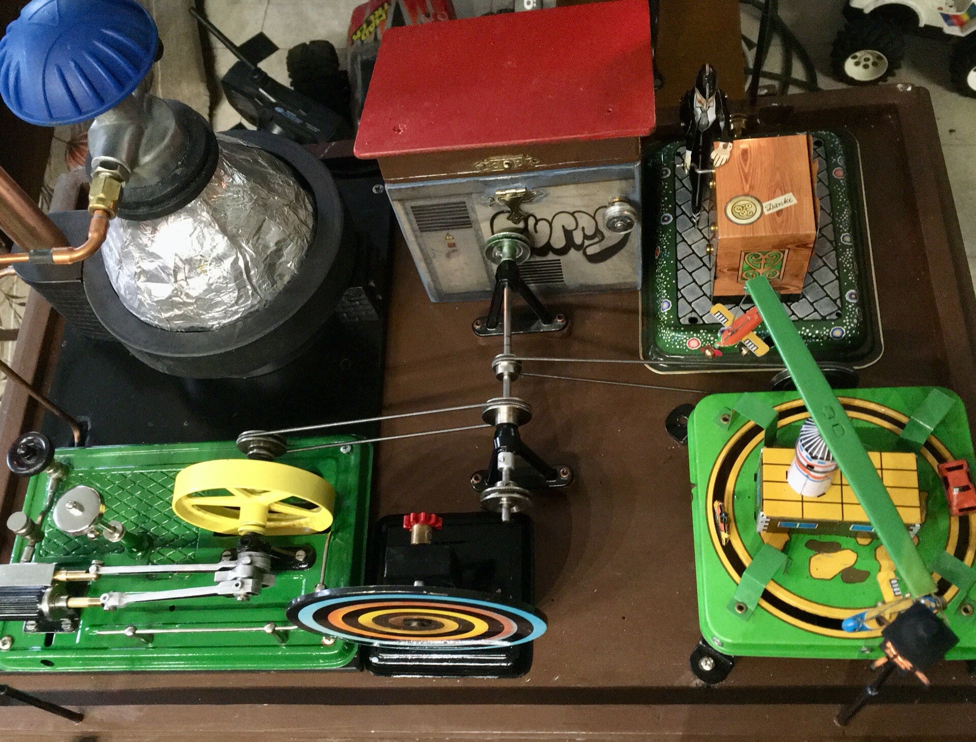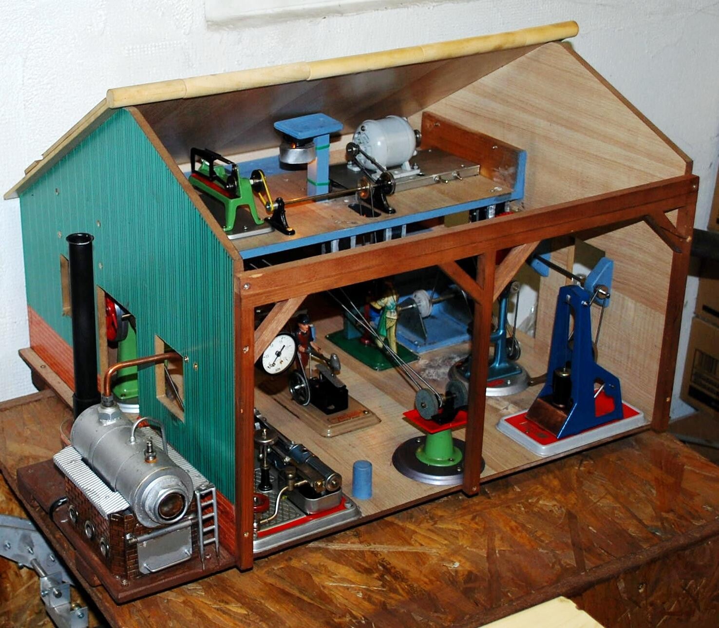 Diese Modell Farikhalle, baute ich für meine Enkel, angetrieben von einer abgeänderten Wilesco D16 , die Antriebsmodelle werden mittels zentraler Transmission zum laufen gebracht, eine typische Art wie man sie anfangs des 19. Jahrhunderts antraf