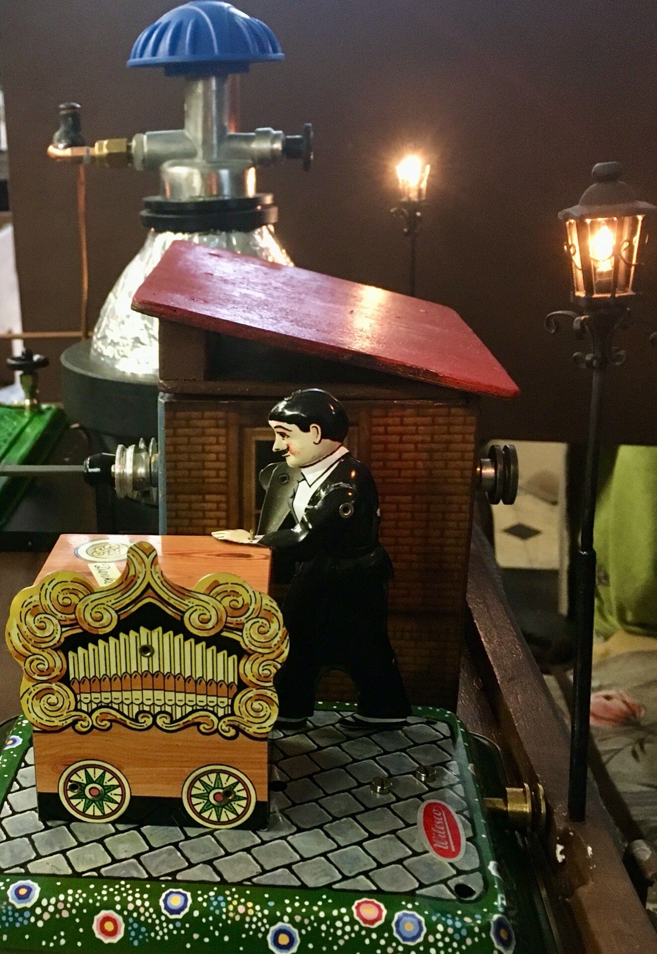 Elektrisch beheizter Dampfkessel mit rauchendem Kamin und sichtbarem Feuer, Antriebsaggregat Wilesco D-16, Karusell, Drehorgel, Trafohaus mit Dynamo für Licht, etc.