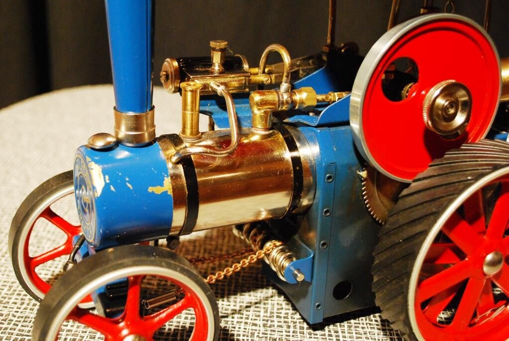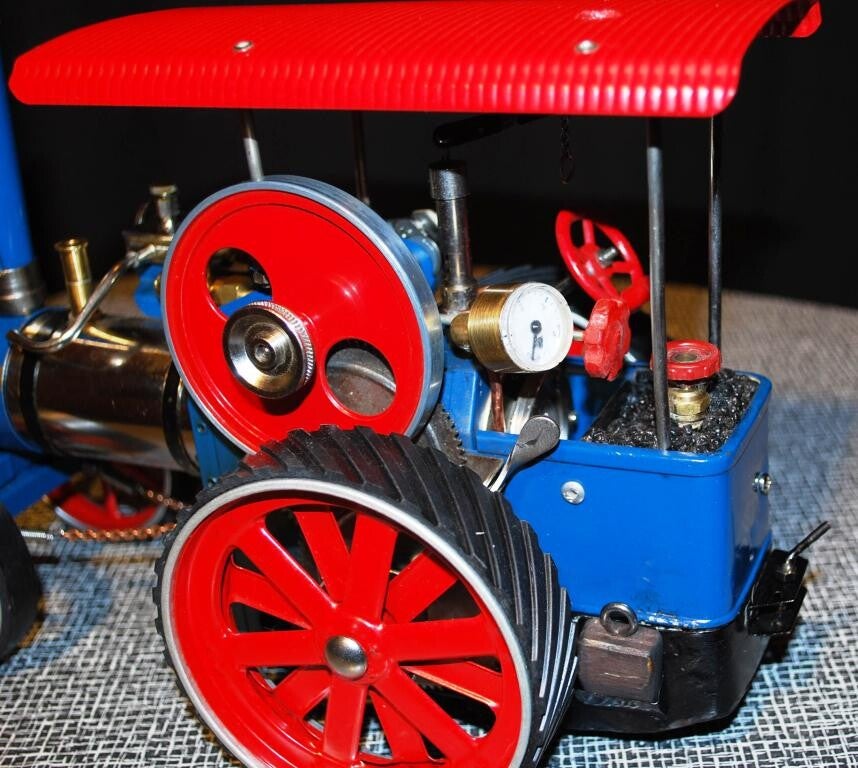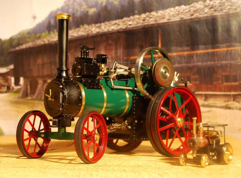 ein etwas "moderner" Dampftraktor, (gebaut für mein Enkel Lukas) mit Gummibereifung, Gasfeuerung zusätzlicher Bandbremse, alle Hebel aus dem Fahrerstand bedienbar, Manometer etc. etc. die Teile sind von Wilesco und Mamod
