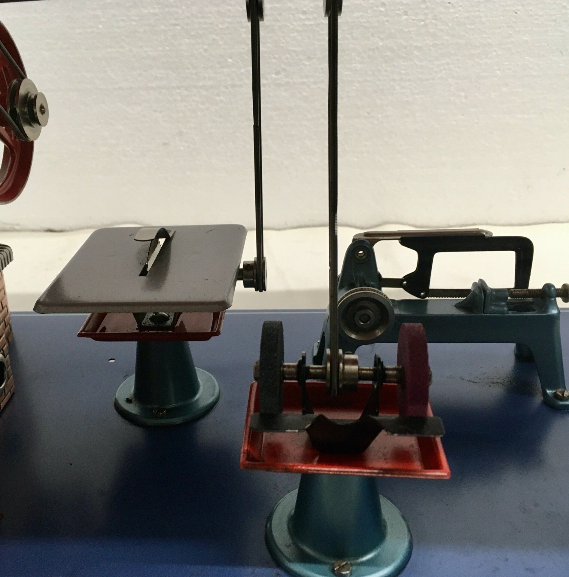 Eine bemerkenswerte Anlage, die der Urform aus der Anfangszeit der Dampftechnik im 19. Jahrhundert entspricht. Hier wird vielfältige Mechanik dargestellt: die Dampfmaschine D 14, treibt via an der Hallendecke befestigte Transmission vier Maschinen an. Kreissäge M 53, Schleifbock M 52, Bügelsäge M 60 und Bohrmaschine M 51.